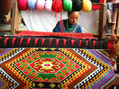 土家語(yǔ)中的“西蘭卡普”是一種土家織錦。“西蘭”是“被面”,“卡普”即“花”,“西蘭卡普”就是土家族的花鋪蓋,是土家姑娘的珍貴嫁妝。西蘭卡普多以絲、棉、麻為原料,一般以紅、藍(lán)、青三種顏色為經(jīng)線,緯線可以自由選擇顏色。用古式織機(jī)、挑花刀采取通經(jīng)斷緯、反面挑織的方法手工挑織而成。西蘭卡普構(gòu)圖大方,織工精巧,花樣豐富,色彩鮮明熱烈而古樸,被稱為土家文化的活化石。