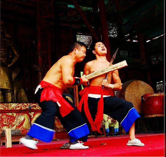 大庸氣功 大庸氣,堪稱武林奇葩,曾為祖國贏得聲譽,海內(nèi)外享有極主名望。 大庸氣功是大庸各民族特別是土家族傳統(tǒng)體育項 目之了,分健體氣派、武術(shù)氣功兩類。前者有“返還 功”、“馬王推氣功”、“少林達摩醫(yī)療保健氣功” 等;后者有靜坐、壁虎、靈子、二指彈、碎石、松靜 、硬氣、五禽、五陽功等,尤以硬氣功著稱。大庸硬 氣功,歷史悠久,漢代相單程,明代覃后,清代劉明 燈,當代湯子模、周鐵鞭、杜心武、趙繼書等都具有 超人硬氣武功。大庸土著民族在漫長的反征服、反壓 迫斗爭,博采武當、少林南北派、昆侖派眾家武林精 華,創(chuàng)造出獨此一家的大庸硬氣功。 據(jù)傳,大庸硬氣功鼻祖是楚國鬼谷子?!?a class="insidelink" href="http://m.pufenprinting.com/cityinfo/15580531721.html" title="永定區(qū)">永定縣 志》有關(guān)鬼谷子隱居天門山鬼谷洞潛心學(xué)《易》、傳 授方術(shù)的記載。到清代有武林高手朱茂嶺,隱居三岔 村北芭蕉灣洞,研究鬼谷氣功之術(shù),后收西溪坪胡口 子、余世萬(即“余通人”)為徙,傳其衣缽。余通 人將武術(shù)氣功系統(tǒng)整理,發(fā)揚光大,播名于世。 新中國成立后,黨和政府十分重視民間氣功發(fā)掘 整理,并正式列為體育項目加以普及發(fā)展,今日大庸 市習(xí)練硬氣功達數(shù)萬人眾。永定區(qū)官黎坪村世有“硬 氣功之鄉(xiāng)”盛譽,該村男女老幼,練功已蔚成風(fēng)氣, 其武師趙繼書,1979年先后參加全省和全國武術(shù)大賽 ,均獲一等獎,受到國家體委重視,同年7 月趙繼書 專程到北京給中央領(lǐng)導(dǎo)同志匯報表演。嗣后,隨同中 國武術(shù)代表團和國家領(lǐng)導(dǎo)人先后兩次出國,到盧森堡 、意大利、比利時、羅馬尼亞、馬其他和東南亞等國 家訪問。他表演的臥刀碎石、頭頂開石、雙鳳灌耳、 頭碰石柱、叉尖推磨等精彩節(jié)目,博得外國友人好評 。盧森堡一位榮獲國家獎牌的武士,看了表演后連夜 來到中國大使館,將自己珍藏多年的獎牌贈送給他; 盧森堡國王主動熱情走上臺與趙繼書熱情擁抱,連連 稱贊:“了不起!了不起!國際氣功大師!”并把珍 藏紀念章一枚贈送給趙繼書。一位法國朋友十分贊賞 說:“中國的氣功,稱為全人類的寶貴財富,是有科 學(xué)道理的。”自此,大庸硬氣功譽滿全球。湖南瀟湘 電影制片廠專門拍攝了彩色紀錄片《大庸氣功》。 大庸硬氣功共有二十多個項目,最有影響的是: 腹臥鋼叉 由二人在地面扶住一根叉尖朝上的三 股鋼叉,叉尖猁鋒利,然后一個俯身叉尖,尖抵腹部 ,待其四肢平展懸空,扶叉二人轉(zhuǎn)動鋼叉,謂之推磨 。表演時,要求臥叉者運氣于腹,氣意集中,稍有大 意,叉即穿腹而過。 臥刀破石 先固定兩把大刀,刀口朝上,臥刀者 運氣后,由其他人抬臥于刀口上(有仰臥、俯臥兩種) ,然后在臥刀者腹部或背部置一碩大石條(約數(shù)百斤) ,一人或兩人輪大鐵錘狠擊石條直至斷裂破碎為止。 釘?shù)洞财剖?地上倒一層碎玻璃片,一人仰臥其 上;然后腹上置釘床,又一人仰臥釘床上,再于第二 人腹上置釘床,第三人仰臥刀床上,腹部上壓一塊數(shù) 百斤大條石,由人掄錘狠砸,至石破為止。 銀槍刺喉 用一根兩頭安有鋒利槍頭的鋼槍,抵 置兩位表演者喉部,然后相對發(fā)力,至槍桿抵成彎弓 形而喉部安然無恙。 徙手斷石 表演者將堅滑如鐵一塊卵石置于石凳 (地)上,然后運氣于掌或指擊斷(碎)卵石。 踢腿斬石 表演者運氣于腿,以腿踢斷石條。一 般可踢斷15公分以上厚度的麻石條或青石條。 胸部打刀 將鋒利大刀刃口置于胸部肌肉上,用 一根拳頭粗木棒猛擊刀背,至棒斷而胸部無傷。 新中國成立以來,大庸民間武術(shù)與民族體育逐漸 融為一體,發(fā)揮著提高人民身體素質(zhì)、弘揚中華武術(shù) 傳統(tǒng)和增進國際友誼重大作用。除硬氣功外,還有數(shù) 十種武術(shù)形式散見于民間武術(shù)體育活動之中。如打飛 棒、扭扁擔(dān)、抵搭斗杠、擠油渣、甩抱腰、舉石鎖、 板牛角(一種斗牛形式)等等。其特點是因地制宜, 不分場地,凡田園地角院壩集鎮(zhèn),都是習(xí)武練功、開 展活動的處所,頗具泥土氣息。擬或以生活中某些動 作和動物的某種形態(tài),稍加模仿演繹,便成某一獨特 武術(shù)形式。如天門武術(shù)功夫大師余道人所創(chuàng)造的“宮 天梳”、“巖燕樸天門”等;也有就地理特點創(chuàng)造某 種武功形式的,如“蕩藤”等。 以上部分圖片均來自互聯(lián)網(wǎng),出處不詳,請作者與本站聯(lián)系。 |