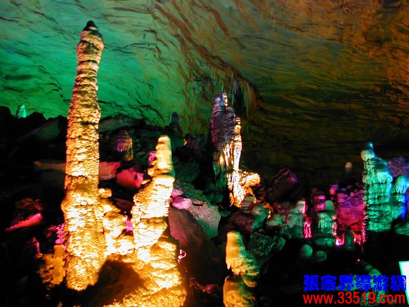 (龍宮)龍宮是黃龍洞十三個(gè)大廳中最大的一個(gè),也是景色最美的景點(diǎn)之一,底面積15000平方米,平均高40米,兩千余根石筍拔地而起,千姿百態(tài),異彩紛呈,或如飛禽走獸,或如宮廷珍藏,有的像巍巍雪松,有的像火箭升空。龍宮后園有金銀兩座花池,清水常溢,花簇盛開。宮頂鐘乳柳垂簾掛,四周壁畫栩栩如生。溶解著各色各樣的礦物質(zhì)的水,從巖層中滲透出來,滴落下來。礦物質(zhì)在洞頂凝固結(jié)晶成倒懸鐘乳石,從鐘乳石滴落的水又把礦物質(zhì)澆疊、堆壘在洞底,而長成節(jié)節(jié)向上的石筍。大家看看這龍宮的造型,領(lǐng)略這磅礴的氣勢。洞內(nèi)最大石筍,高12米、直徑10米的漢白玉天然石椅“龍王寶座”居高臨下,眾多石柱石筍似人似物,維妙維肖,圍著寶座朝拜山呼,幾十座珊瑚亭亭玉立,儼然一支龐大的“宮廷樂隊(duì)”。湖南著名教授羊春秋先生作《寄生草》詞對此進(jìn)行描繪:“百態(tài)千姿模樣,三宮六院門巷。龍王開宴設(shè)瓊漿,猴王偷果鬧天堂,君王納寵擁羅帳。搬演了人間爭攘,匯集了天下奇觀。”