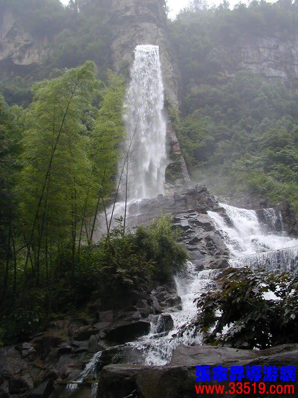 (聽瀑樓)朋友們,寶峰湖游結(jié)束了,大家一路辛苦了?,F(xiàn)在,我提議到“聽瀑樓”歇歇腳,洗洗汗,聽聽音樂,養(yǎng)好精神再趕路。你們看這民族式建筑,背依砂巖石峰,面朝寶峰飛瀑,登斯樓也,品土家之香茶,聽瀑布之濤聲,此情此景,怎不令人感嘆人與自然傾心交談的空靈境界?