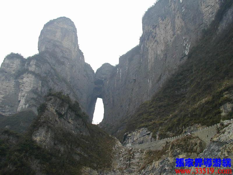 (俯視天門)站在這里可以俯視面向北面的天門洞,以及天門山公司正在修建的通天大道。1999年11月世飛賽期間,中央電視臺(tái)6號(hào)機(jī)組正是在這里拍攝飛機(jī)穿越天門驚人場面的。這兒距天門洞垂直高度200多米。