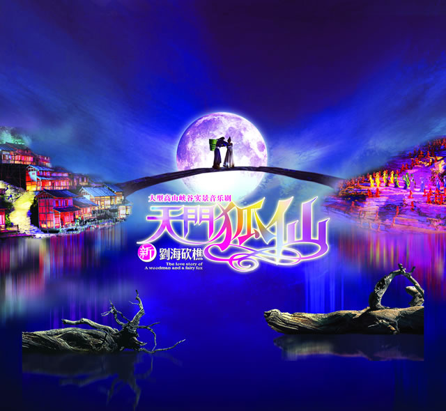 《天門狐仙——新劉??抽浴纺壳笆鞘澜绲谝慌_有完整故事情節(jié)的山水實景音樂歌舞劇。舞臺選址在天門山風景區(qū)山門口內至天門山頂?shù)恼麠l峽谷,總投資達到1.2億元,演員隊伍達530多人。主舞臺以10000平米的玻璃鋼打造,是目前世界最大的全景玻璃鋼舞臺。音樂主創(chuàng):譚盾。