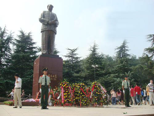 毛澤東銅像位于韶山沖的中心,紀(jì)念館、毛氏宗祠與韶山賓館之間。銅像區(qū)占地5200平方米,是經(jīng)中共中央批準(zhǔn)興建紀(jì)念毛澤東同志誕辰100周年的重點(diǎn)獻(xiàn)禮工程。這里原是一片沃野,地勢平坦開闊,周圍群山拱護(hù)。韶蜂在遠(yuǎn)處,高峻挺拔,云富坨大山巍峨雄壯,十八羅漢山逶迤綿長,黑石寨鐵骨錚錚。在山的襯托下,銅像更顯得氣勢磅礴。
