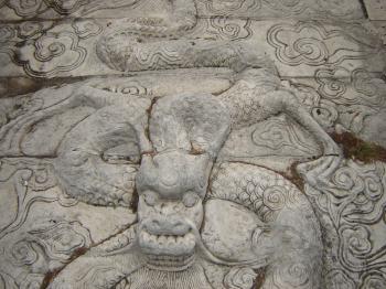廟前面有學宮坪,亦名學坪,坪南端有大明壁。廟宇紅墻黃瓦,氣勢宏偉。正門曰奎星門,前院左右各植檜樹,常年翠綠,散發(fā)幽香??情T內有月形泮池,池周護以石欄。泮池附近有石坊三座,正南石坊匾額鐫有“斯文在茲”四字,東西兩坊貫通街衢。通過石坊便是大成門。進門左右是飛檐綠瓦的鐘鼓亭。大成門通向大成殿,有石鋪甬道直抵大殿臺基。臺高一米,全系石塊疊成。臺階分左右兩道,中有石雕盤龍,綴以云海波濤,栩栩如生,躍然石上。大成殿為歇山式重檐結構,周圍有16根圓石柱,內外枋、檁、藻井、斗拱、扇梧均五彩施繪,黃瓦飛檐,蔚為壯觀。殿后有亞圣殿,與大成門、奎星門前后襯應,更顯出大成殿主體的雄偉。