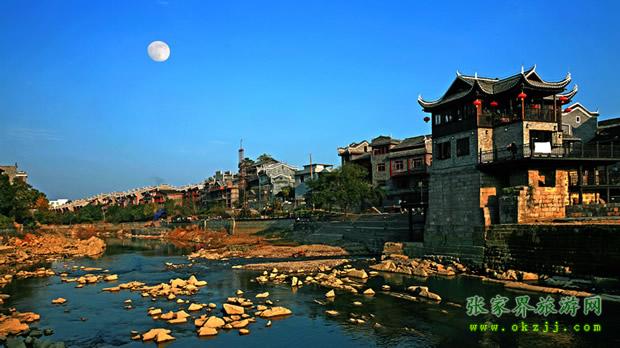 乾州古城城池小巧玲瓏,石城墻垣逶迤回環(huán)1980m,高5m,方溶江穿城而過,沿江古街上被歷代行人的腳磨得光亮的青石板,既自然又精巧地鑲嵌著,沿街建有苗族特有的民宅——吊腳樓,具有濃郁的民族風(fēng)格。