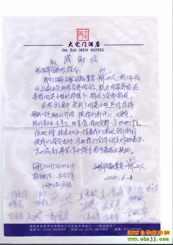 - 游客夏先生為表揚導(dǎo)游李姣姣寫來表揚信致我張家界... [14811]