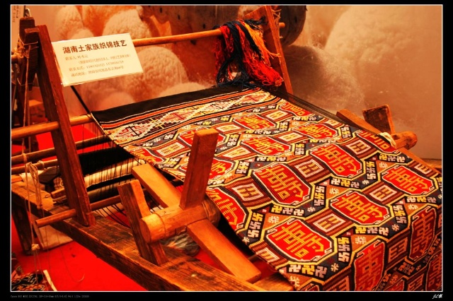 土家織錦,就是土家姑娘用一種古老的木腰機,以棉紗為經(jīng),對五彩絲線或棉線(當今也有用毛線)為緯,完全用手工織成的手工藝術(shù)品。土家織錦的藝術(shù)品種,經(jīng)過一兩千年的演變,現(xiàn)在已發(fā)展到100多個,除原有的“西蘭卡普”(即被面花)以外,又根據(jù)時代的變化織出了各種圖案的壁掛、香袋、服飾、旅游袋、沙發(fā)套、坐墊、地毯、室內(nèi)裝飾等多種工藝美術(shù)品。聰明的土家姑娘,她們心靈手巧,表現(xiàn)山水,表現(xiàn)人物,表現(xiàn)樹木花卉與飛禽走獸,形象逼真,栩栩如生。 土家織錦產(chǎn)區(qū)主要分布在龍山縣苗兒灘、張家界、撈車及靛房、坡腳;永順縣縣對山、風棲;保靖縣的普絨、清水等地。春秋戰(zhàn)國時期,“表布”(即土家錦)即已成為貢品。
