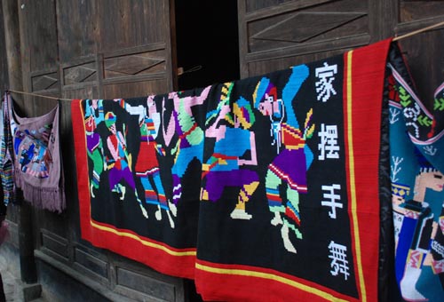 土家織錦在境域民間主要用于被面及小孩用的窩窩被、腳被、蓋裙,亦是姑娘陪嫁、定情及民俗活動跳擺手舞時的披甲和祭祀用于堂前的壁掛。土家錦的圖案主要源于生活,已知名的達100余種,大致分為6大類:動物題材有馬畢(小馬)、石畢(小動物)、陽雀花、燕子花、大龍紋、小龍紋、蛇花、貓腳跡、風紋、蝴蝶牡丹和老鼠嫁女等;植物題材有蓮花、韭菜花、九朵梅、巖墻花、大刺花、藤藤花等;日常用具題材有椅子花、桌子花、箱子八勾、豆腐架、桶桶花、船船花、鋸齒花、梭子花、背簍花等;抽象幾何勾狀紋有單八勾、雙八勾、四十八勾、十二勾、二十四勾及勾紋變種紋飾;以吉祥文字表現(xiàn)的有福祿壽喜、萬字流水、一品當朝及田字紋、壽字紋等;取材天象的有太陽花、整月花、半月花、梭羅花、滿天星等。 土家錦的織造方式,歷代沿用自漢代以來的腰機式斜織機。民間織機一般長約5尺,寬約2尺多,高約3尺。所用材料,為蠶絲或棉線,用棉葉、棉梗、茜草、土靛、紫莓、土紅、黃珠子等物染色。