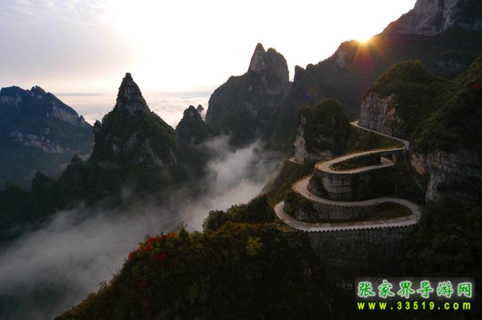 通天大道與天門(mén)山索道、天門(mén)洞開(kāi)、空中花園并稱(chēng)天門(mén)山四大奇觀,它共有九十九道灣,在索道上俯看如巨龍騰起,如玉帶盤(pán)纏,直通天際,使人為之震撼,堪稱(chēng)天下第一公路奇觀。由此可直抵天門(mén)洞下天梯前。