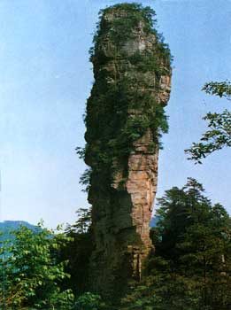 [南天一柱] 過南天門120米,東南幽谷峰林中有一高達(dá)200多米的孤峰,宛如擎天玉柱。上部灌木點(diǎn)綴,中部巖身赤裸,下部樹木遮掩,峰體渾圓、偉岸,因立南天門下而得名。