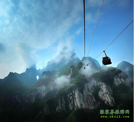 天門山景區(qū)距離張家界城區(qū)僅8公里,登天門山不需爬山,天門山索道直達(dá)山頂。天門山索道下站位于市內(nèi)官黎坪區(qū),4路、5路、10路等多路公交車可抵達(dá),通體透明的玻璃建筑加上兩扇藍(lán)色羽翼的造型,整個索道下站就如一只展翅欲飛的鴿子,是喧嘩鬧市中一道別致的風(fēng)景線。